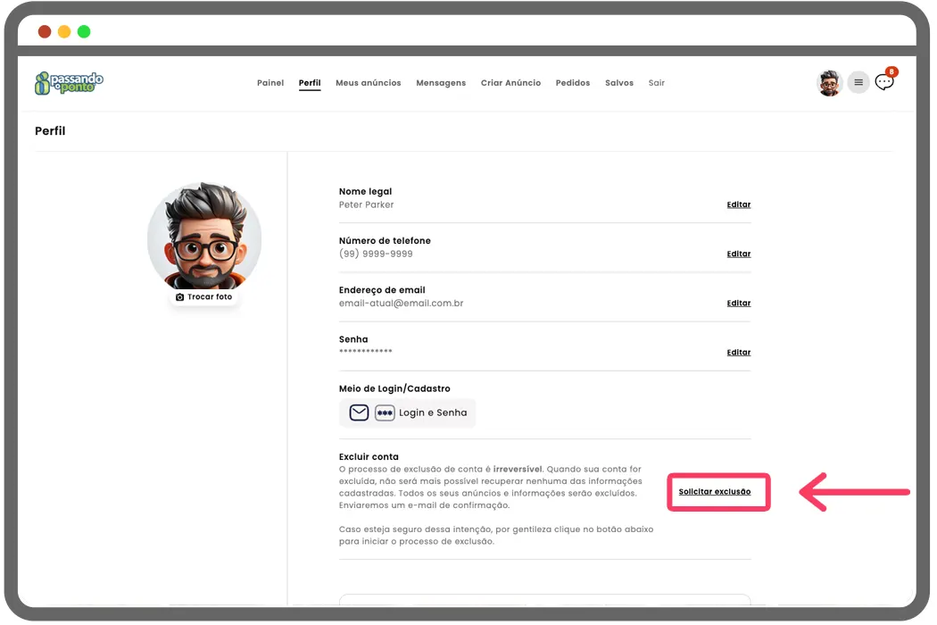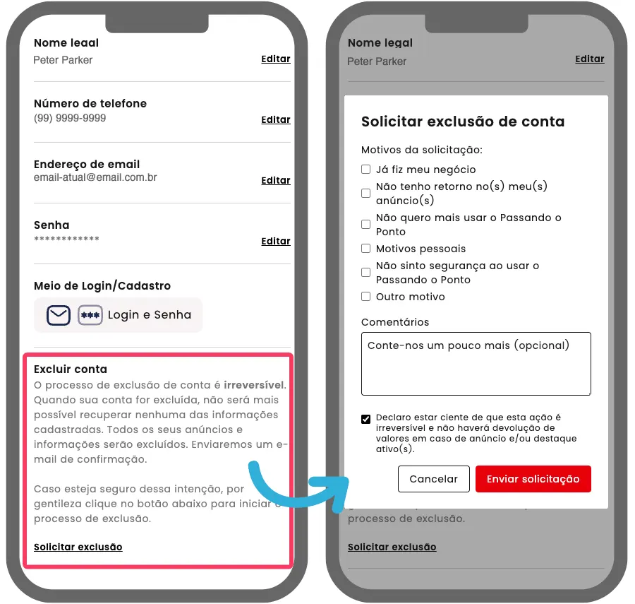 - Ao optar por a excluir sua conta todos os seus dados da conta, anúncios e perfil serão excluídos e não será possível recuperar sua conta.